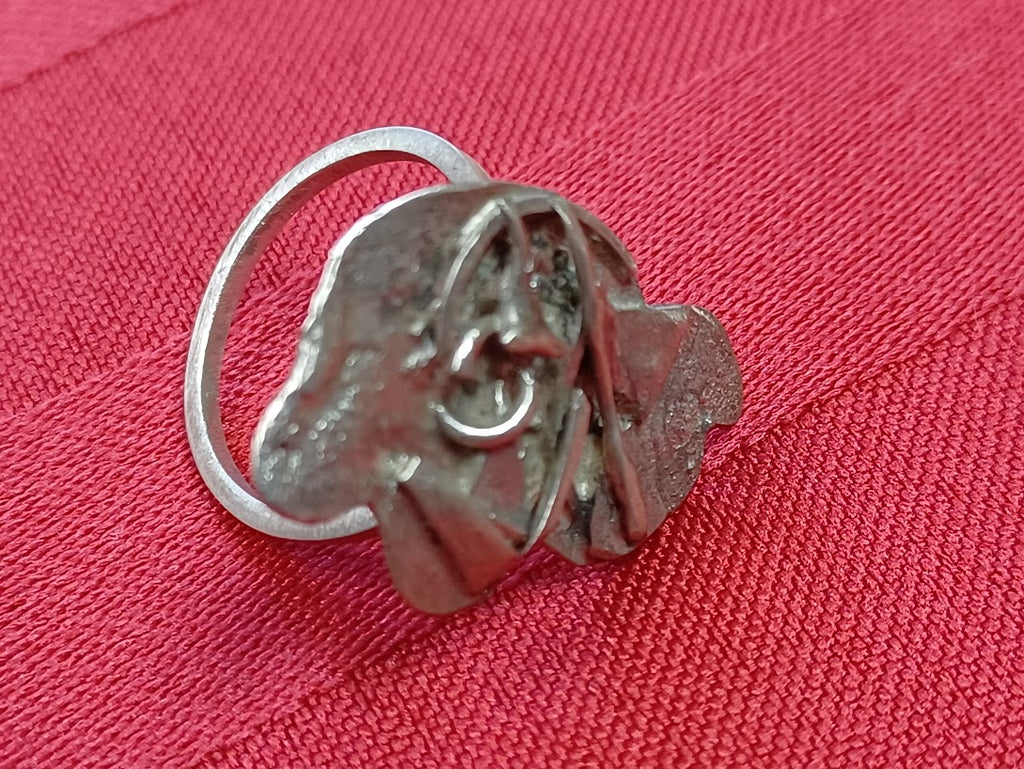 Handcrafted from recycled sterling silver, this abstract ring combines sustainable craftsmanship with contemporary design. The fluid, geometric form catches light beautifully, making it a versatile statement piece for everyday wear or special occasions. Each ring is individually made, ensuring a unique finish that reflects the artistry of ethical metalwork. Perfect for those who value both aesthetic appeal and environmental responsibility.