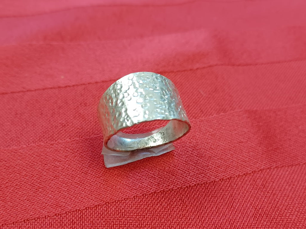 Handcrafted from solid sterling silver, this ring showcases the distinctive texture of traditional hammer work. Each piece is individually crafted, creating subtle variations that make your ring truly one-of-a-kind. The hammered surface catches light beautifully, adding depth and visual interest to an elegant, timeless design. Perfect for everyday wear or special occasions, this versatile ring pairs effortlessly with other jewelry. A testament to skilled artisanal craftsmanship, it's an investment piece that will endure for years to come.