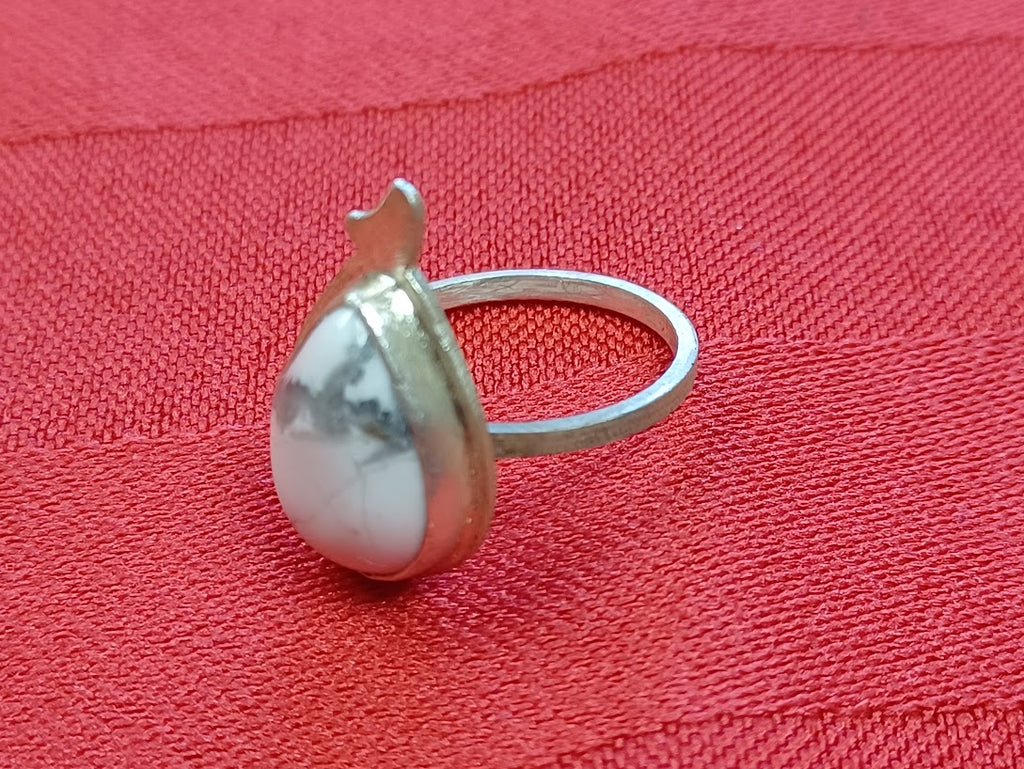 Sterling Silver and White Stone Ring Crafted from premium sterling silver, this handmade ring features a luminous white stone centerpiece that catches light with subtle elegance. Each piece is individually created by skilled artisans, ensuring unique variations in finish and character. The stone's cool brilliance complements the warm luster of polished silver, making it versatile for everyday wear or special occasions. A timeless design that balances contemporary aesthetics with traditional metalworking craftsmanship.