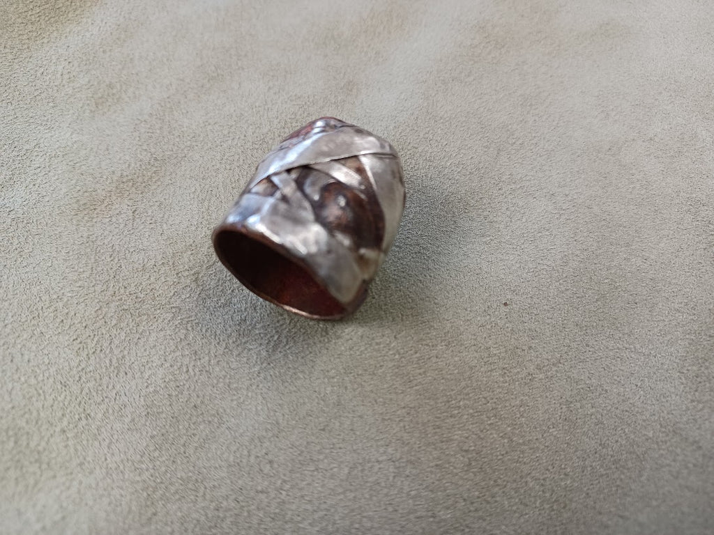 Each ring is individually handcrafted from sterling silver and copper, combining precious metals with warm, earthy tones. This piece showcases artisanal metalwork and timeless design. Custom orders are welcome—send your preferred size and design reference to info@athenasilversmith.com to commission a personalized version tailored to your specifications.