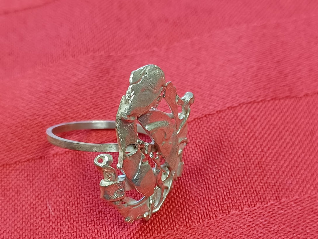 Crafted from recycled sterling silver, this ring showcases artisanal metalwork with a distinctive design that reflects both sustainability and timeless elegance. Each piece is individually handmade, ensuring no two rings are identical. The use of reclaimed silver reduces environmental impact while maintaining the lustrous quality and durability of fine sterling silver. Perfect for those who value conscious craftsmanship and one-of-a-kind jewelry.