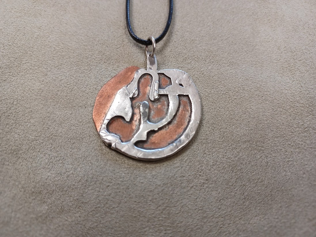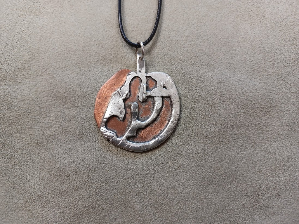 Handcrafted pendant combining warm copper and lustrous sterling silver, suspended on an 18-inch black cord for versatile styling. Each piece showcases artisanal metalwork with the distinctive patina and character that develops naturally over time. The contrasting metals create visual depth while the adjustable cord length accommodates various necklines. Perfect for those who appreciate jewelry with substance and craftsmanship.