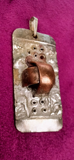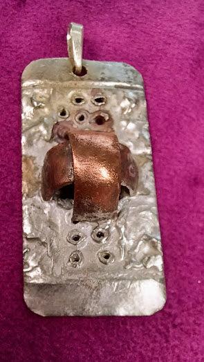 Two-inch copper and silver pendant reminiscent of a medieval shield crafted with texturized silver. An 18-inch black cord is included, if you want to substitute the cord for a 18-inch sterling silver chain let us know.